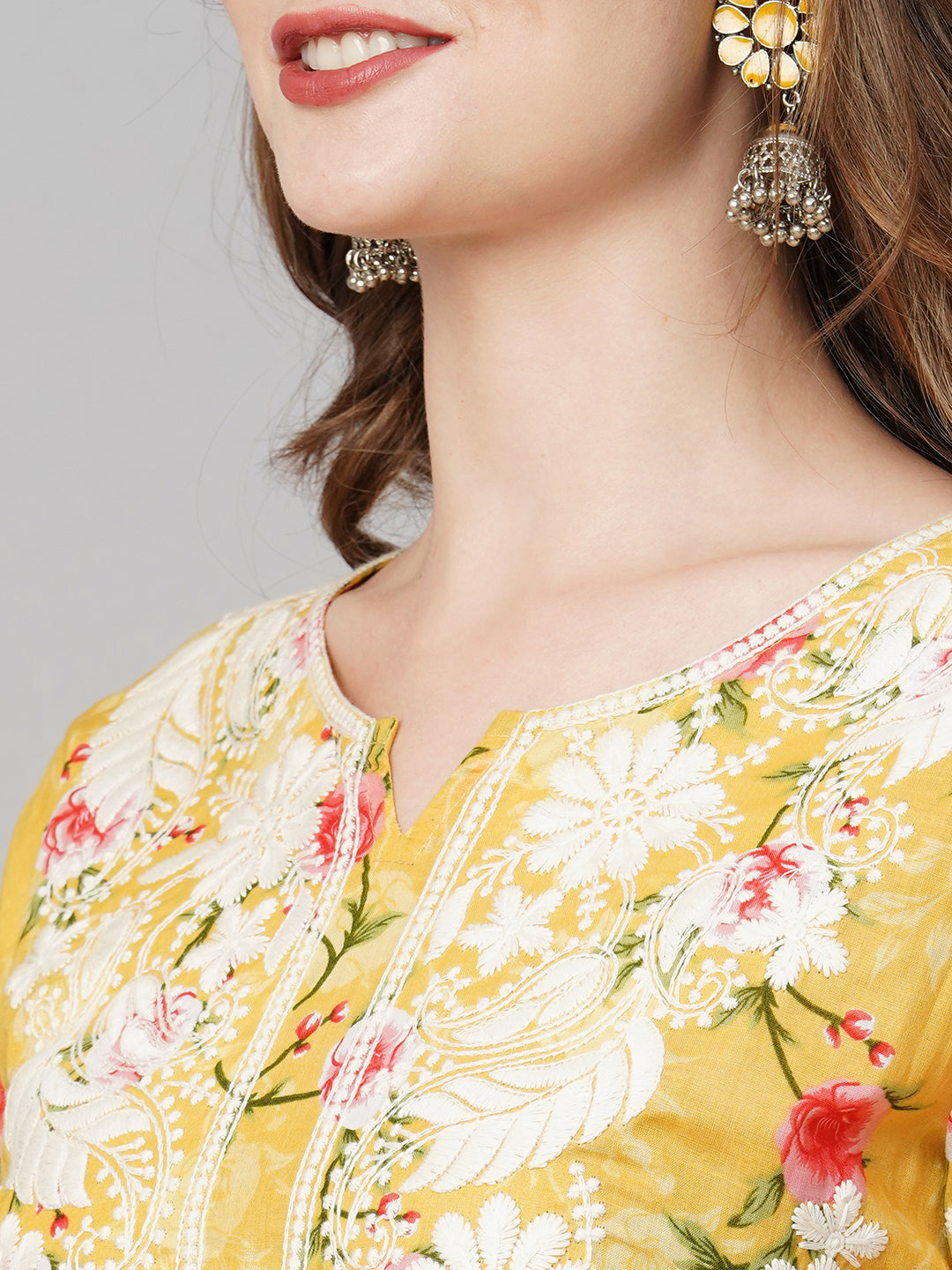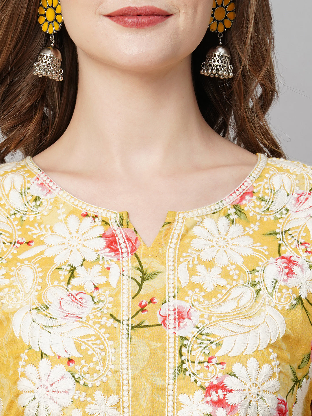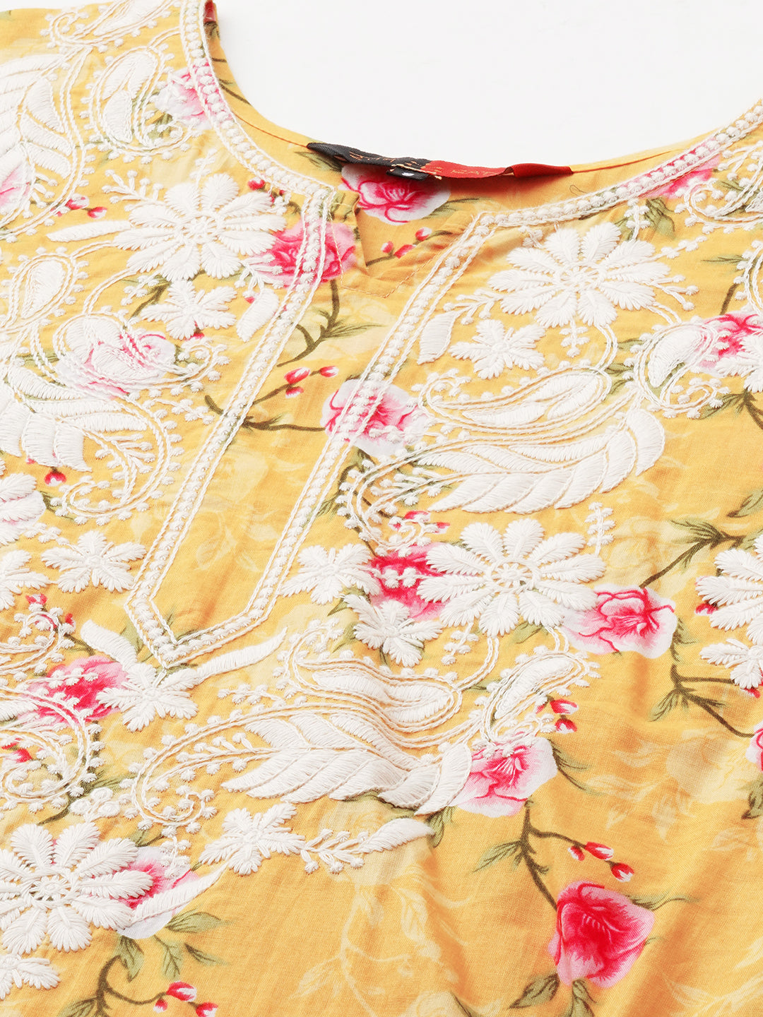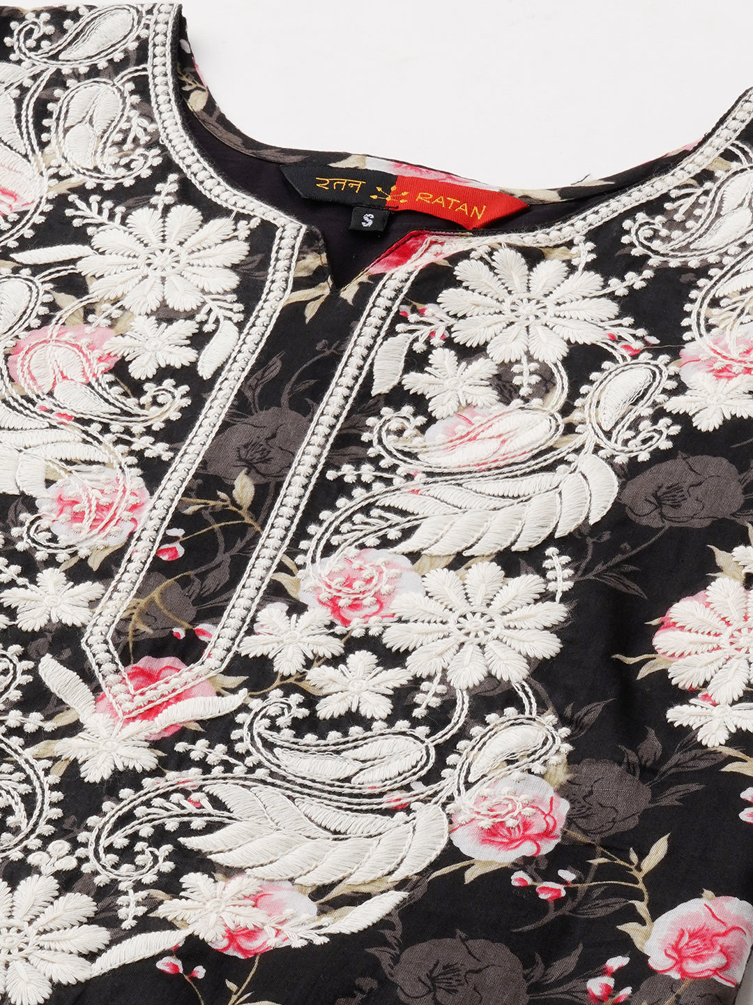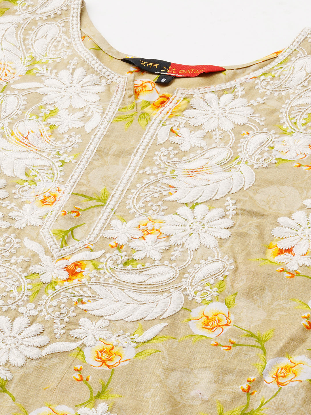 Bringing you this cotton printed straight kurta with chikankari embroidery  by RATAN. It features round neck which shows rich chikankari on the neck design and 3/4th sleeves in soft fabric for extra comfort.. The chikan stitches used such as, `Ulti Bakhiya' , `Phanda' , `Ghas patti 'and `Keel kangan'. The motifs placed on this kurta make it really craft worthy and is appealing to the senses giving you that rich charismatic look. The Kurta features intricate needlework designs in various floral and paisley patterns