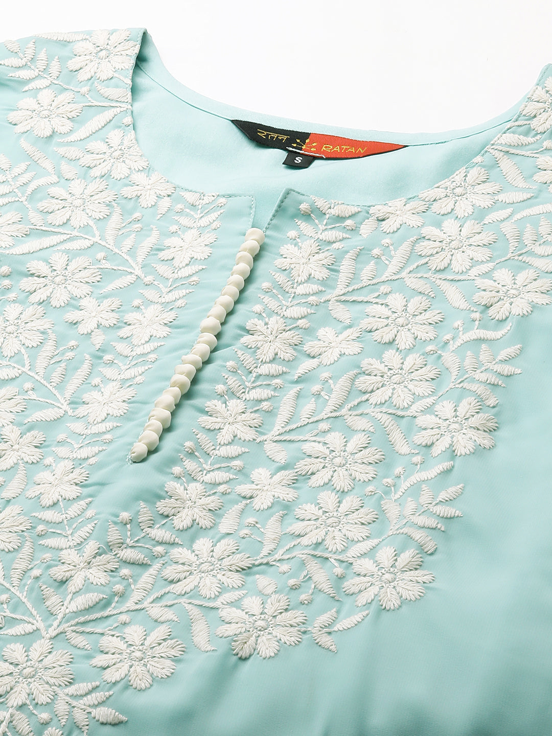 Bringing you this georgette straight kurta with chikankari embroidery  by RATAN. It features round neck which shows rich chikankari on the neck design and 3/4th sleeves in soft fabric for extra comfort.Pair up with contrast cigarette pants/ palazzos/ denims or leggings and a clutch and step out in style.The simplistic elegancy is accentuated, in this stitched kurti. The chikan stitches used such as, `Ulti Bakhiya' , `Phanda' , `Ghas patti 'and `Keel kangan'. The motifs placed on this kurta make it really craft worthy and is appealing to the senses giving you that rich charismatic look. The Kurta features intricate needlework designs in various floral and paisley patterns. It is often white on pastel-colored fabric and can be worn for both formal and casual occasions. The Kurta is comfortable, elegant, and suitable for all seasons.
