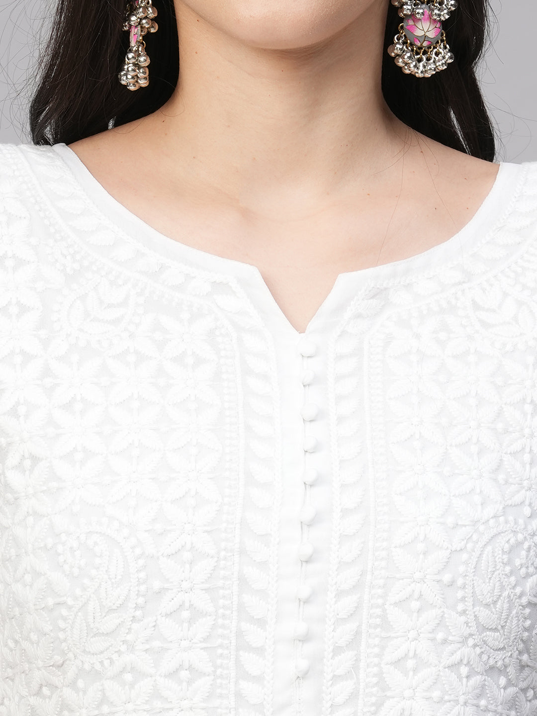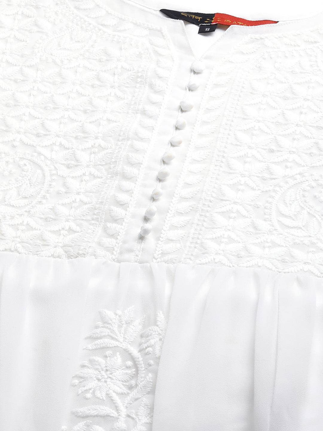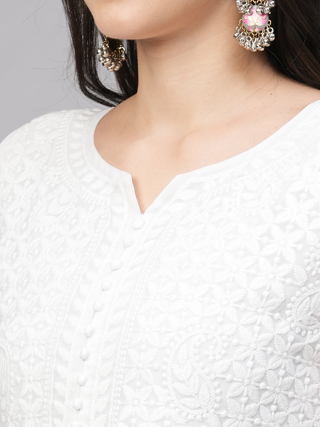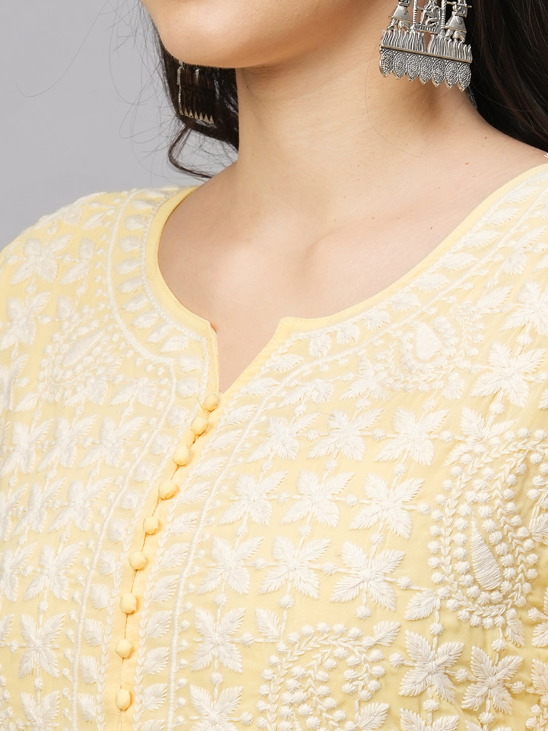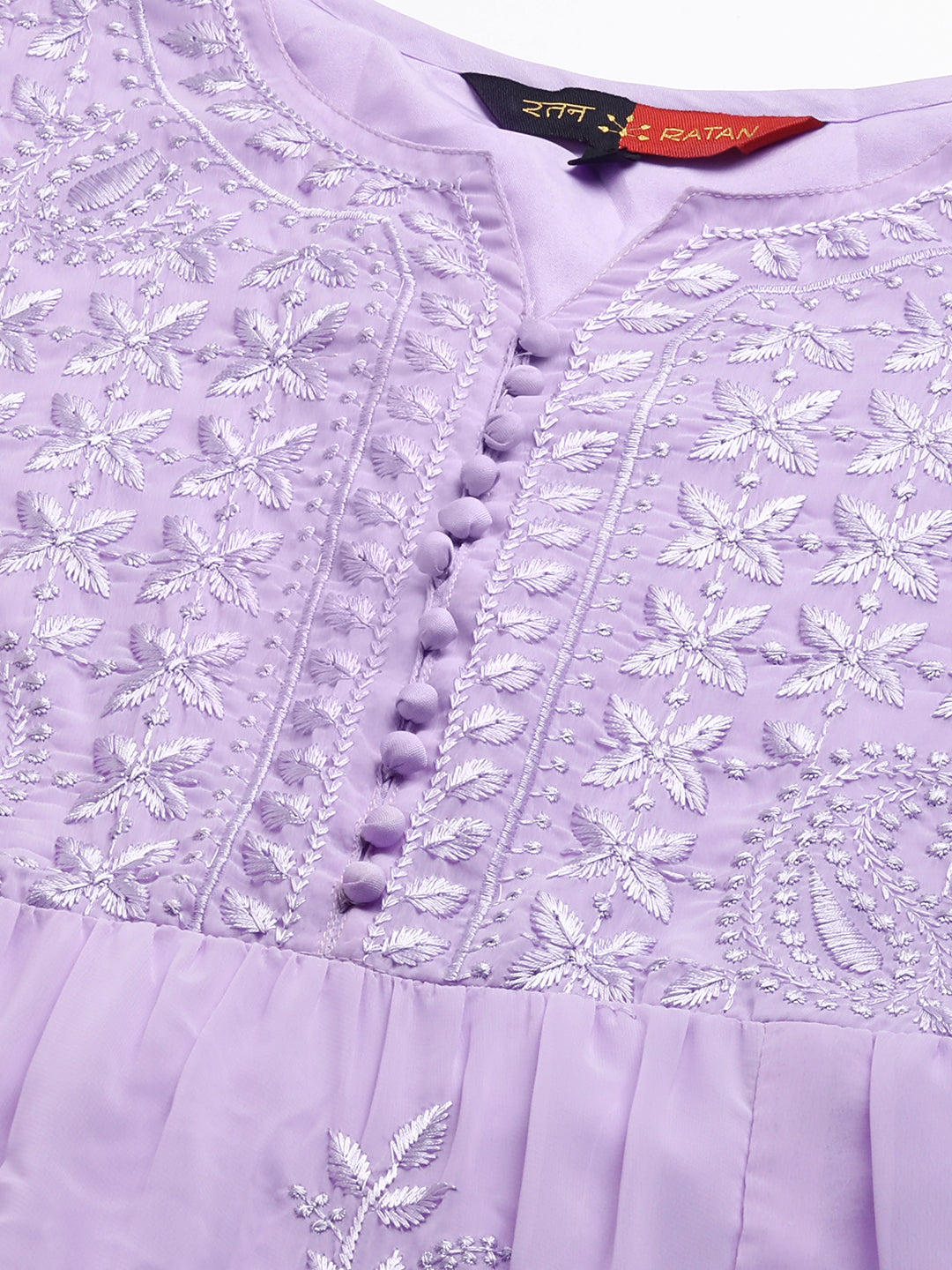 Bringing you this georgette flared kurta with chikankari embroidery by RATAN. It features round neck which shows rich chikankari on the neck design and 3/4th sleeves in soft fabric for extra comfort. Floral motifs with ‘intricate embroidery’ are delicately placed on this Chikankari Kurti, this perky embroidered Lucknowi Chikan Kurti is a reminiscent of blooming springs and the serenity that surrounds it. The chikan stitches used such as, `Ulti Bakhiya' , `Phanda' , `Ghas patti 'and `Keel kangan'. Your skin will surely fall in love with soft fabric that will keep you comfortable all day long